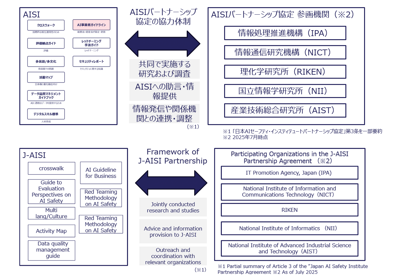 To advance AI safety, it is essential for J-AISI and domestic organizations to work together. With support from the relevant ministries and agencies, we have established the J-AISI Partnership as a collaborative framework for promoting AI safety initiatives.